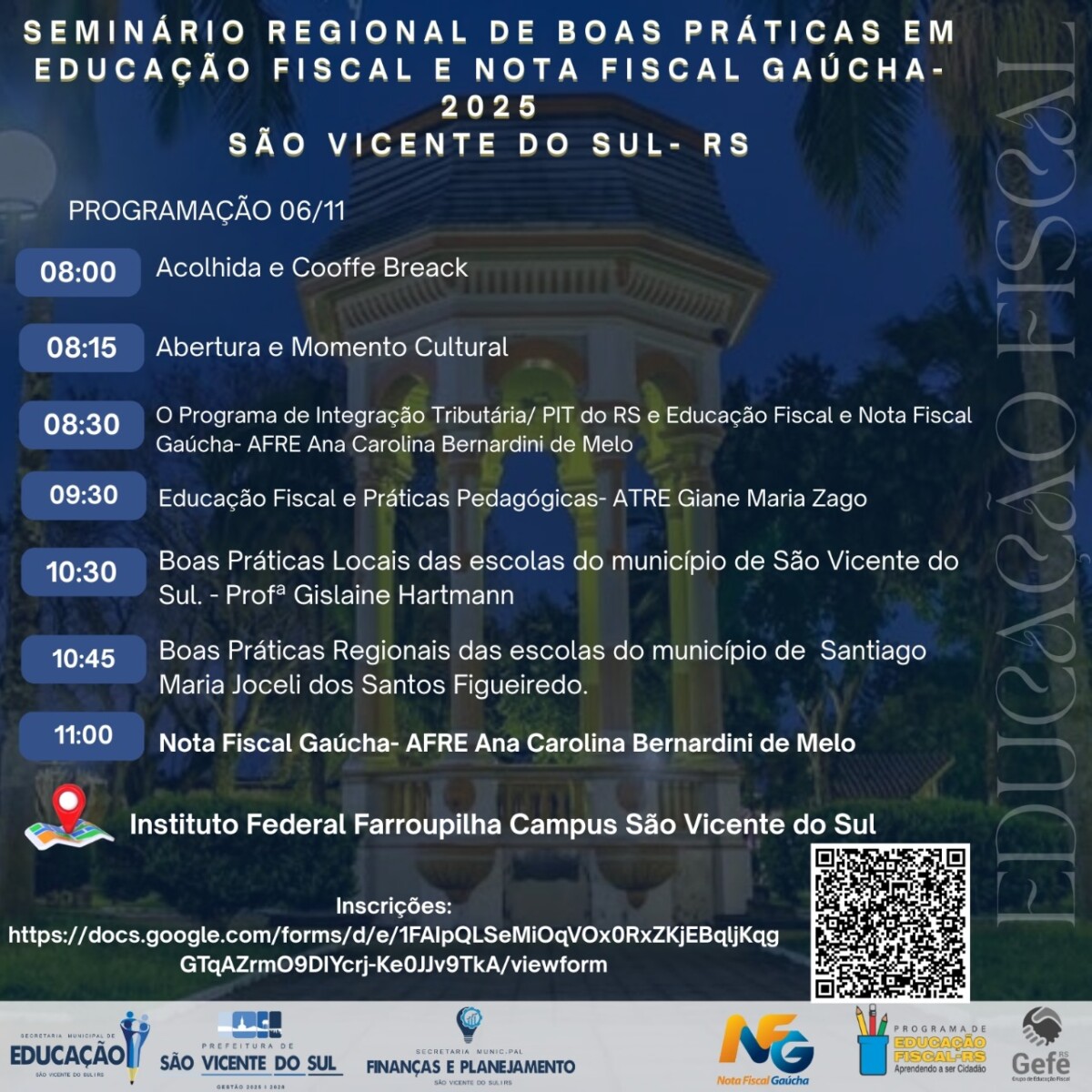 O município de São Vicente do Sul sediará o Seminário Regional de Boas Práticas em Educação Fiscal e Nota Fiscal Gaúcha no dia 6 de novembro, um encontro voltado à troca de experiências, práticas pedagógicas e fortalecimento da cidadania fiscal. O evento será realizado no Instituto Federal Farroupilha – Campus São Vicente do Sul e contará com a presença de especialistas, educadores e representantes regionais.